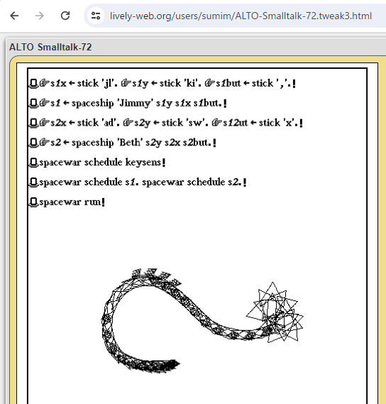 もちろん、今回の spaceship や stick のインスタンスの使い方は Smalltalk-72 のオブジェクトとしてはいろいろ問題ことはわかっていたのですが、元の Smalltalk-71 の記述に寄せたり、明示的にメッセージを送らずともプロシージャのように振る舞うオブジェクトもカッコイイかなぁ…などと軽く考えたのが運の尽きでした。